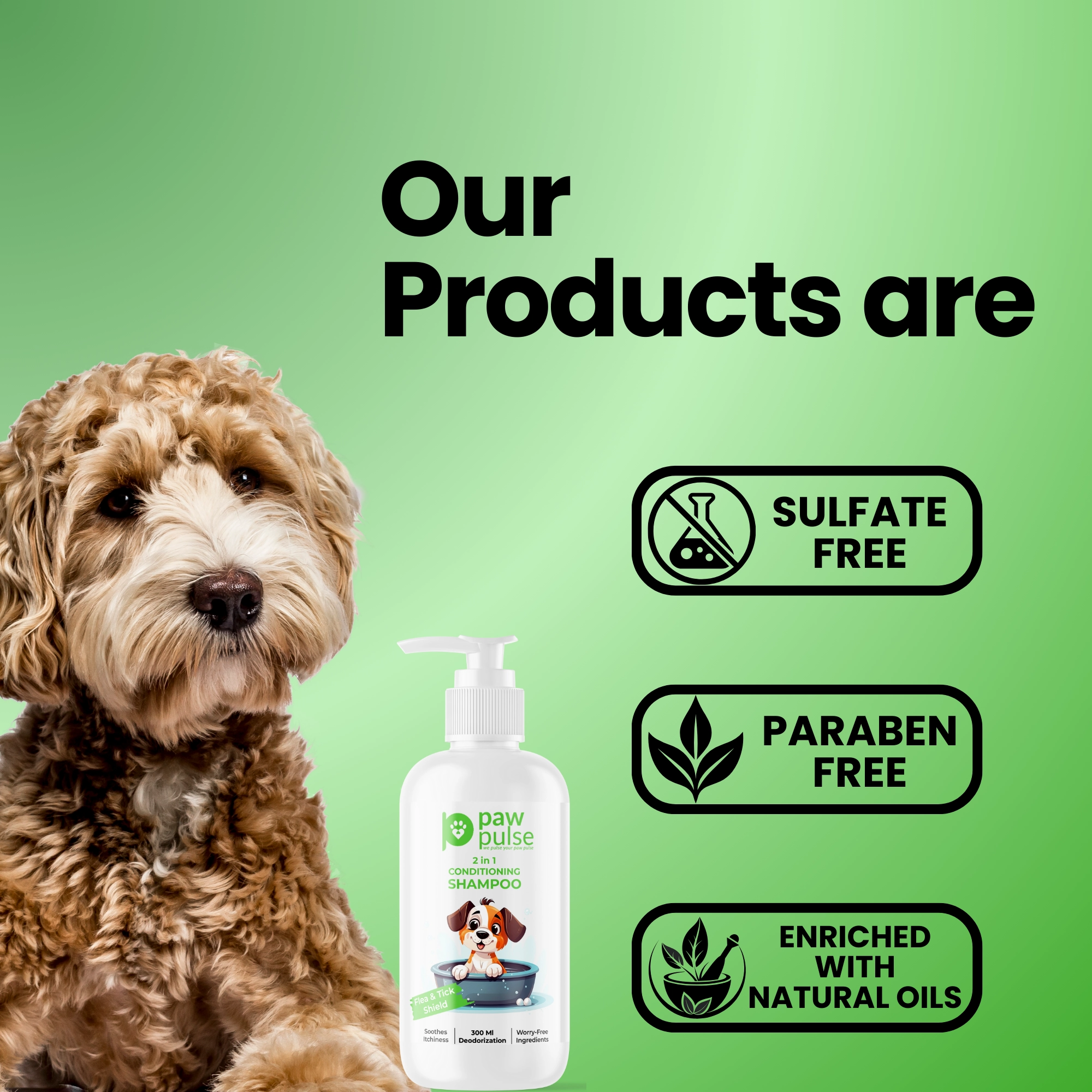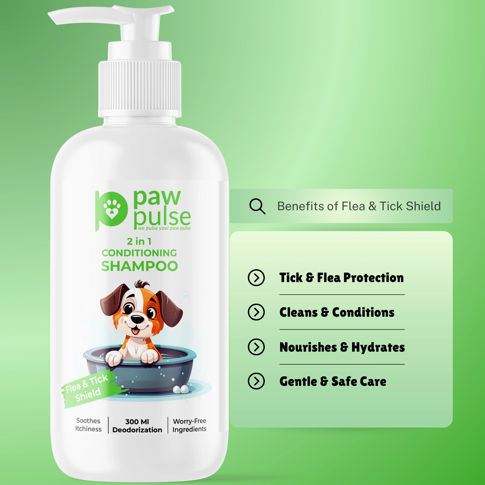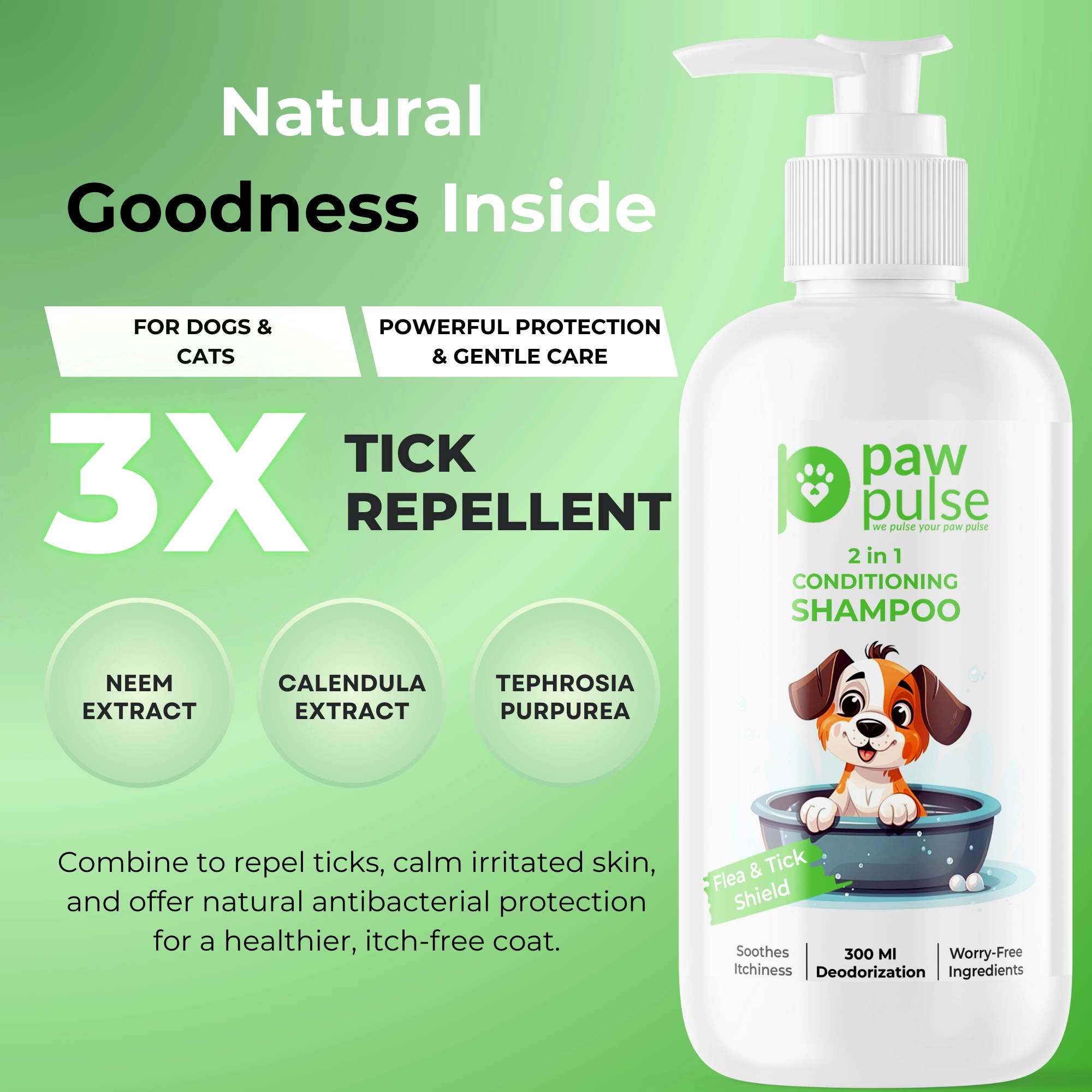 Pawpulse 2-in-1 Conditioning Dog Shampoo for ticks and fleas is a plant-based, chemical-free substitute that revitalises and cleans your dog’s or cat’s coat without using any harsh chemicals or detergents. It is free of alcohol, parabens, SLS, and PEG-80. This shampoo concentrate contains Tailaparnni, Vacha, Sharpunkha, and Neem, which are ingredients that help repel fleas and ticks naturally for up to a week. It soothes itchiness and deodorises your pet’s coat while using worry-free ingredients. To use, wet your pet’s coat thoroughly, apply a small amount of the concentrated shampoo, massage into a rich lather, working from head to tail, rinse thoroughly, then towel dry and gently brush the coat afterward. It is for external use only and should be kept out of reach of children. While allergic reactions are uncommon, discontinue use if irritation occurs.